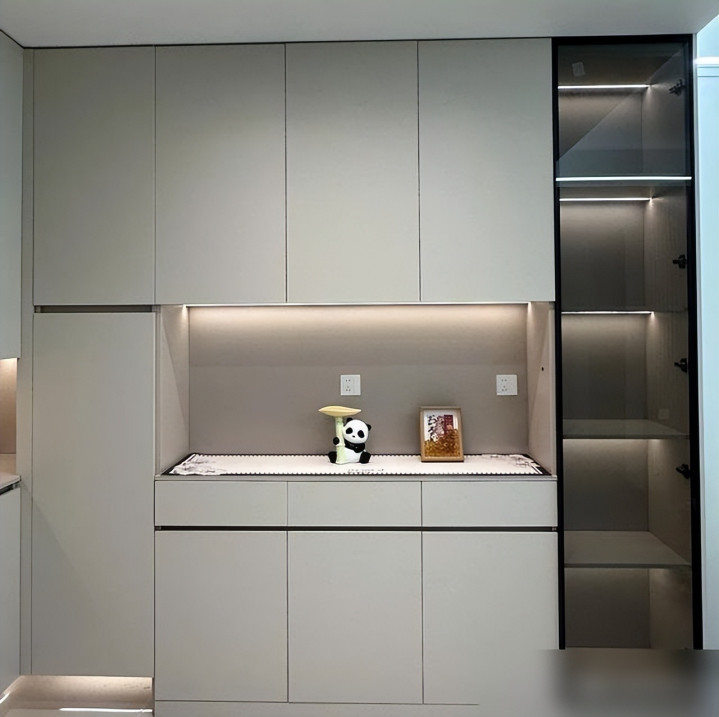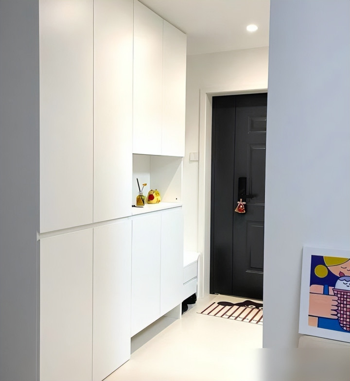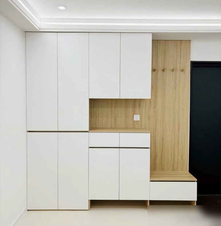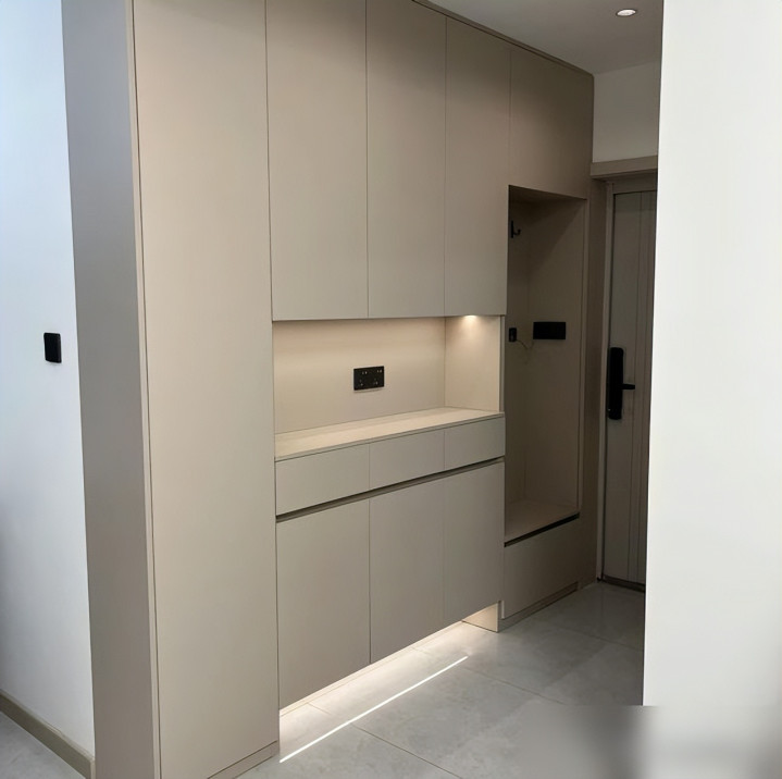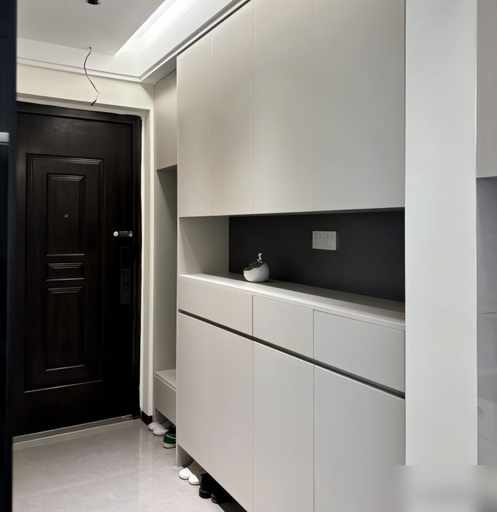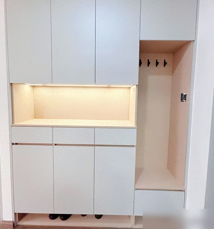 再讲深度,我家做了30cm,看着薄挺好看,结果冬天棉鞋根本塞不进去,鞋跟露在外头,显得玄关特乱。