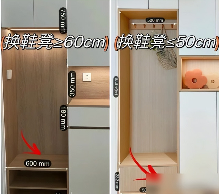 上次看邻居家做了60cm宽的换鞋凳,坐着换鞋特舒服,还能放个小包包在旁边,才懂这尺寸多重要——要是空间不够,装个折叠的也行,总比蹲地上强吧?